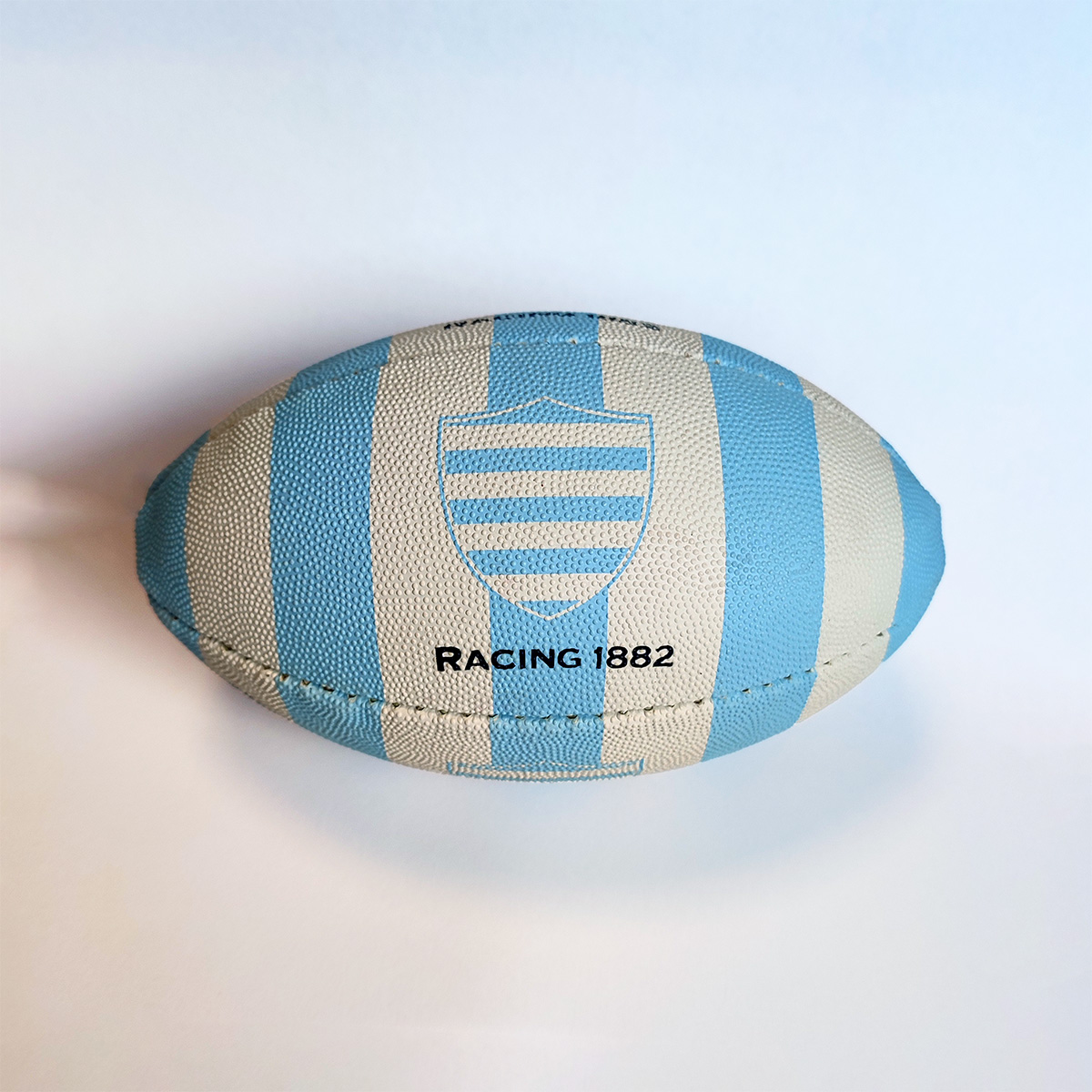 Ce mini ballon de rugby Gilbert est un hommage vibrant au Racing 92, célèbre club de rugby à XV. Conçu pour les passionnés et les jeunes supporters, il reprend avec fidélité les rayures emblématiques bleu ciel et blanc, symbole fort de l’identité visuelle du club.