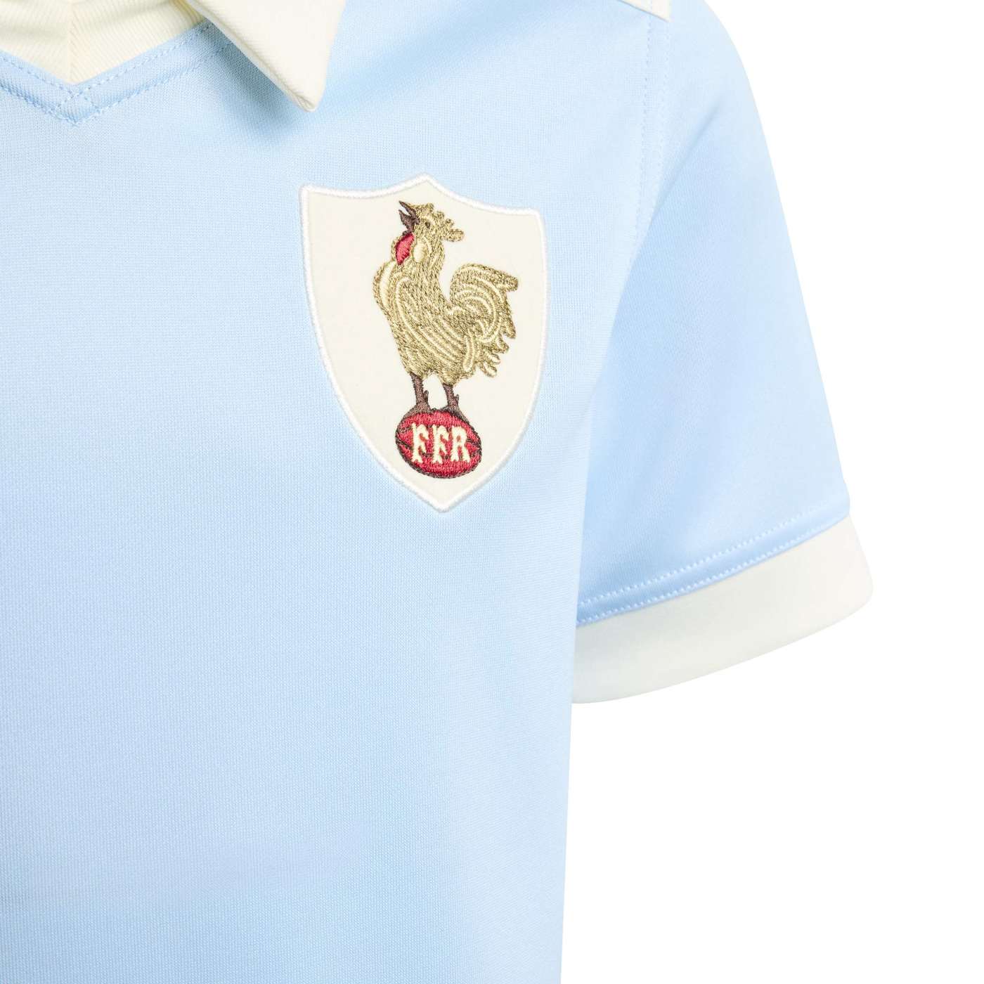 Le maillot replica France Rugby 120 Years pour enfants célèbre l’héritage légendaire du rugby français en rendant hommage aux 120 ans de rivalité entre la France et l’Angleterre, connu sous le nom du « Crunch ».